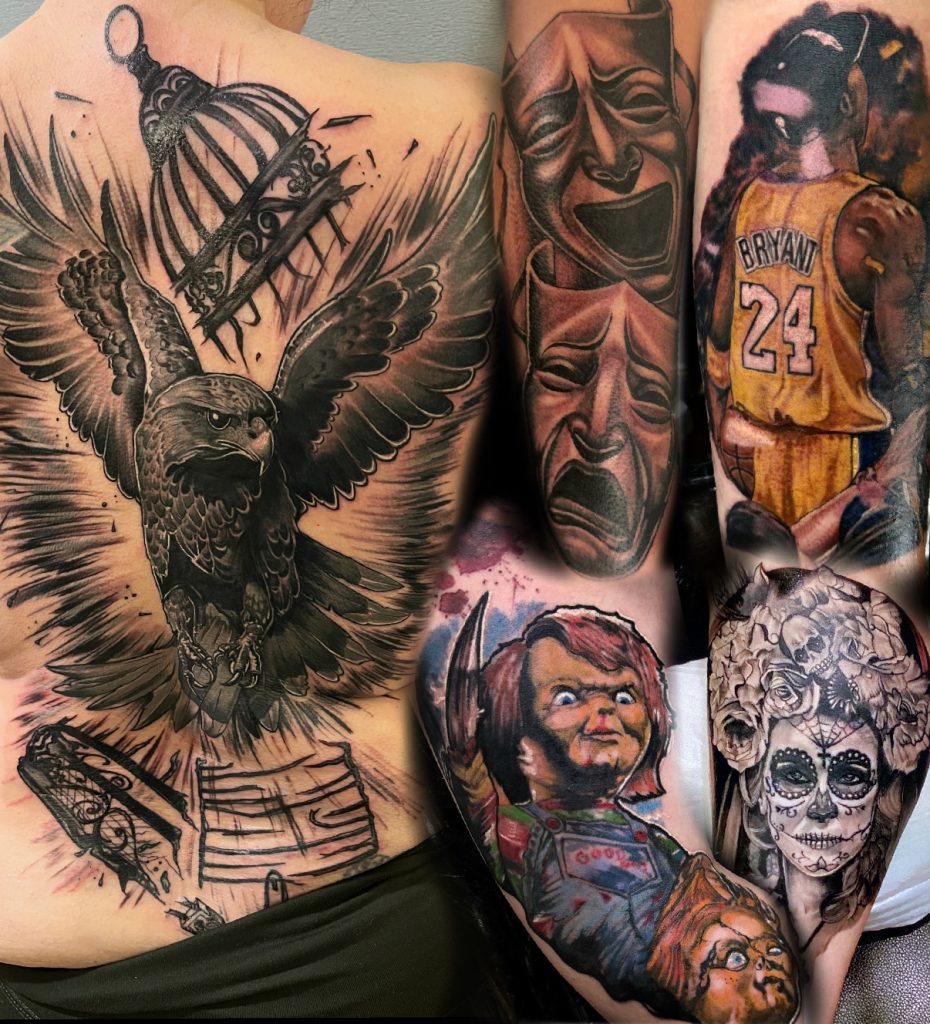 Tattoo Artists with 18+ years experience focused on Pop Culture character designs from StarWars, Disney, Horror, Comic Book, Anime and everything in between. Licensed LucasFilms Tattoo Artist specializing in Color or Black and Grey realism tattoos and illustrative designs.